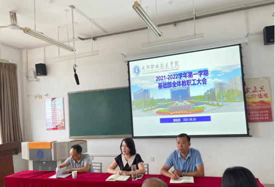8月30日下午,基础部在教学楼701召开新学期全体教职工大会,就全省高校领导干部暑期读书班的学习内容和全院管理干部大会会议精神展开深入学习,并就新学期各项工作做具体部署。基础部全体教职工参加会议。会议由基础部副主任韩向阳主持。